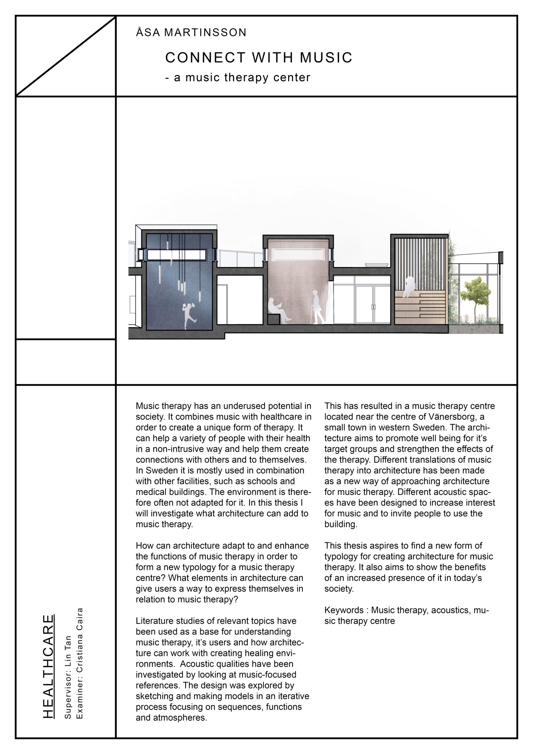 Music therapy is a form of therapy that utilises the potential of music in order to give its clients a better life quality. Usually it is performed in leftover spaces designed for other functions. This master’s thesis has been an investigation of what potential a building specifically dedicated to music therapy could have.